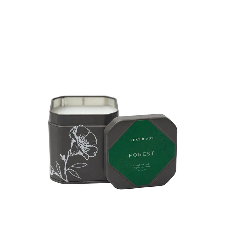 These fragrant candles in charcoal tins with white botanical sketches are hand poured with a coconut wax blend and finished with a cotton wick.