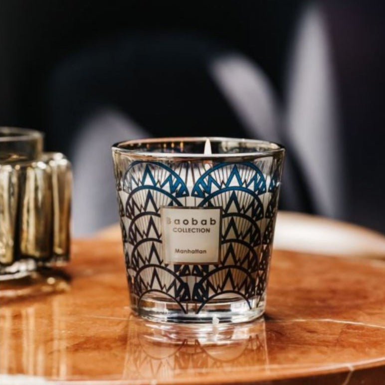 The Manhattan scented candle is poured in a glass that bears a platinum and navy blue screen-printed design inspired by the art deco architecture of the Chrysler building.