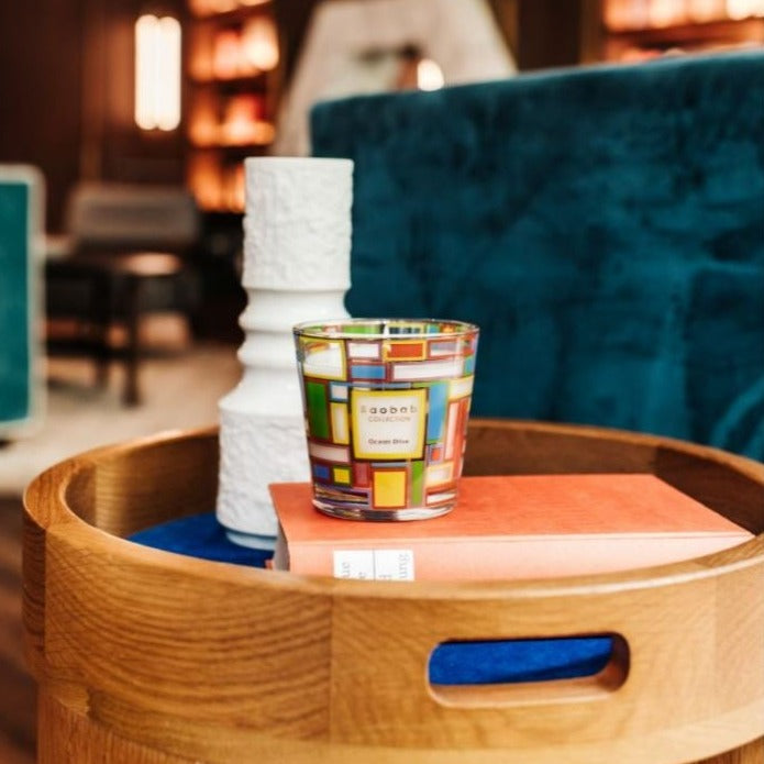 The candle’s design is an abstract interpretation of the neon colors of Ocean Drive’s windows, notes of mandarin and cedar will take you to the city’s vibrant atmosphere.
