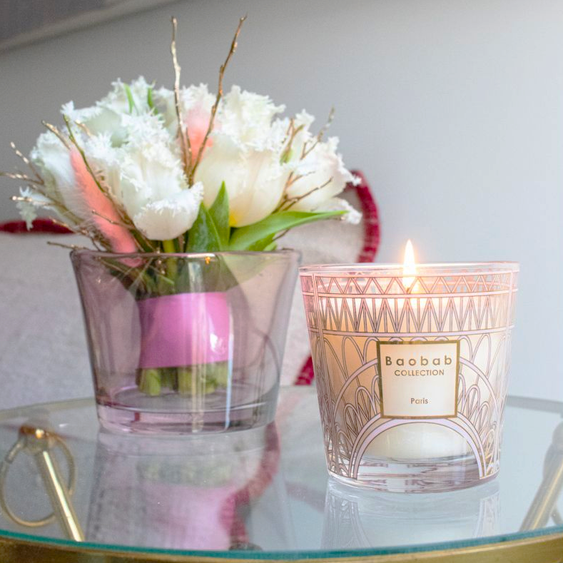 The Paris scented candle is decorated with a powder pink and gold silkscreen print that resembles the stylized structure of the Eiffel Tower. We celebrate the beautiful month of May in Paris, memories of chestnut and green blossoms.