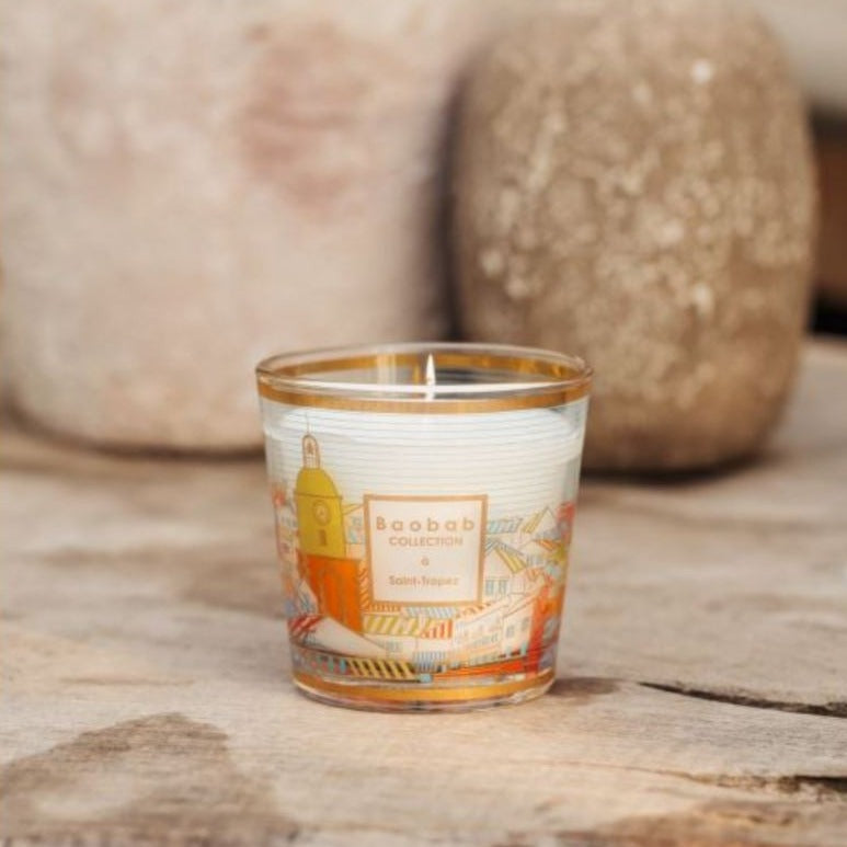 The Baobab Collection Saint Tropez scented candle is decorated with a multicolored and gold silkscreen print based on the roofs of this village’s homes and featuring its mythical bell tower.