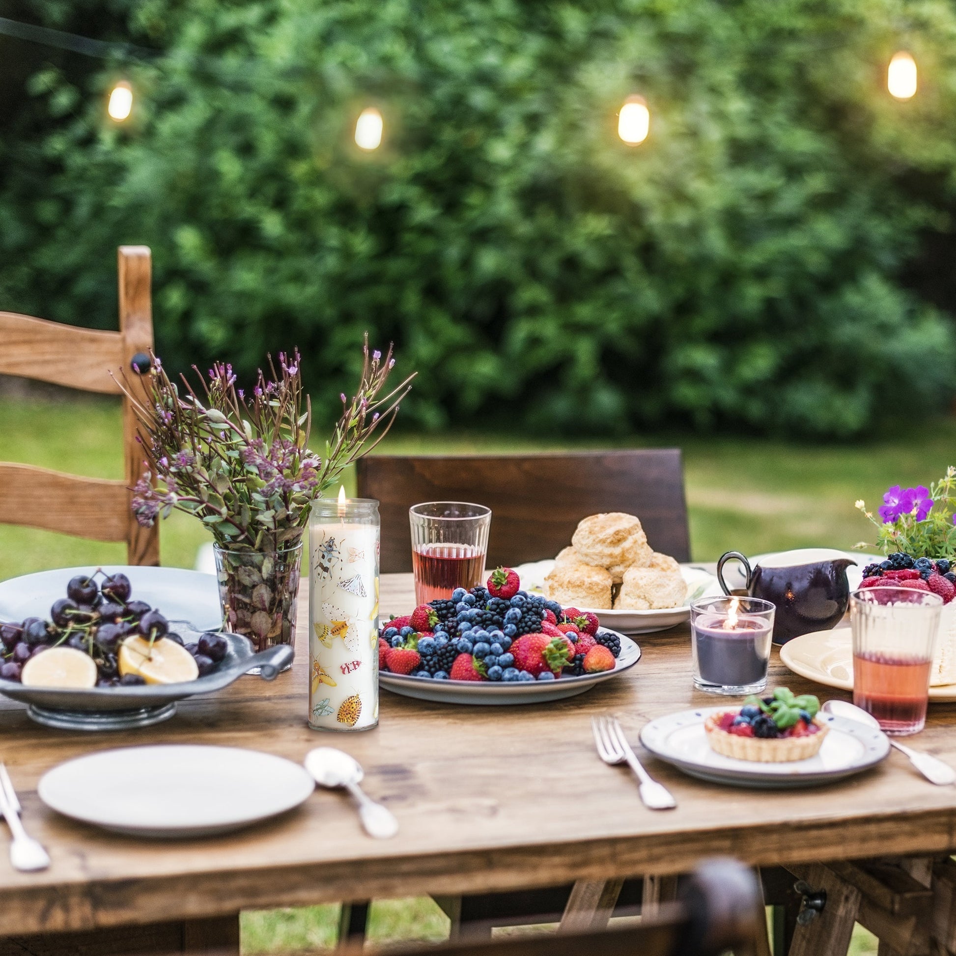 Infused with real essential oils in a creamy coconut-soy blend wax, this cathedral-style candle burns beautifully, releasing the refreshing aroma into the air. The tall cathedral-style glass vessel showcases original artwork by Melissa Wang and can be repurposed as a cheerful flower vase. This candle makes a great hostess gift for a summer party.
