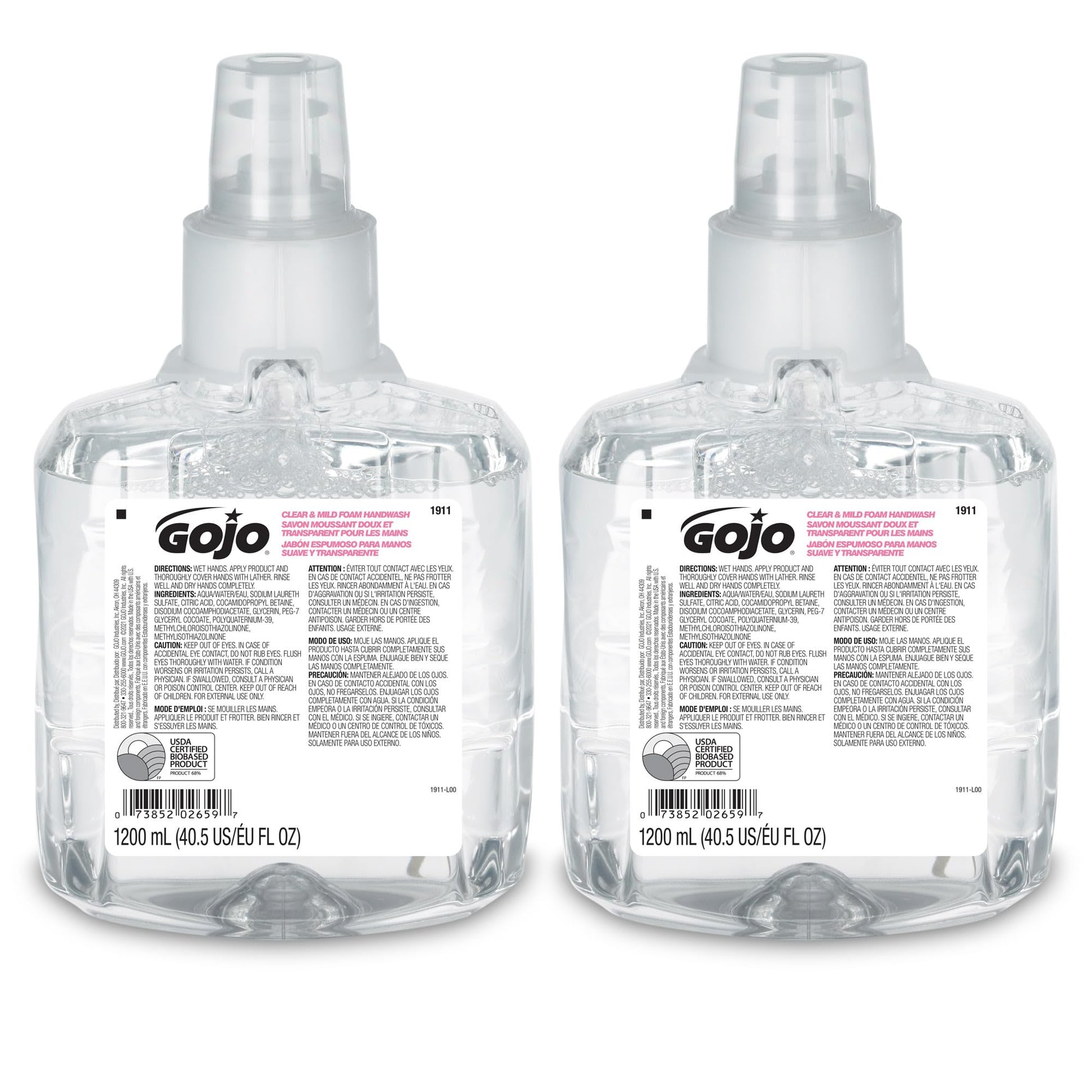 Gojo Clear & Mild Foam Handwash, EcoLogo Certified, 1200 mL Foam Hand Soap Refill LTX-12 Touch-Free Dispenser (Pack of 2) - 1911-02