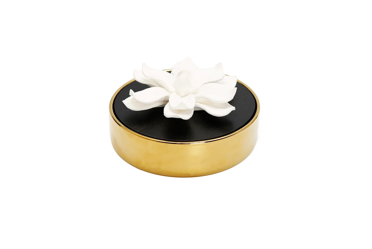 Gold Round Diffuser Black Lid and White Flower/Iris and Rose Aroma