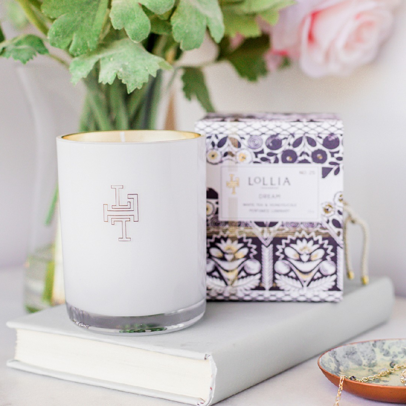 Full of enticing details – from a die cut fragrance preview to chicly knotted ties – each keepsake box contains a modern monogrammed candle within, washed in a captivating gold.
