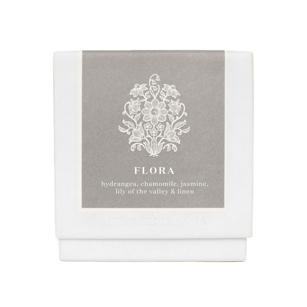 The Monika Hibbs Home Room Candle No. 04. Inspired by the lightness of spring, the Flora room candle is crafted to bring fresh notes of delicately blooming florals to your home. An underlying touch of linen blends beautifully with sweet botanicals.