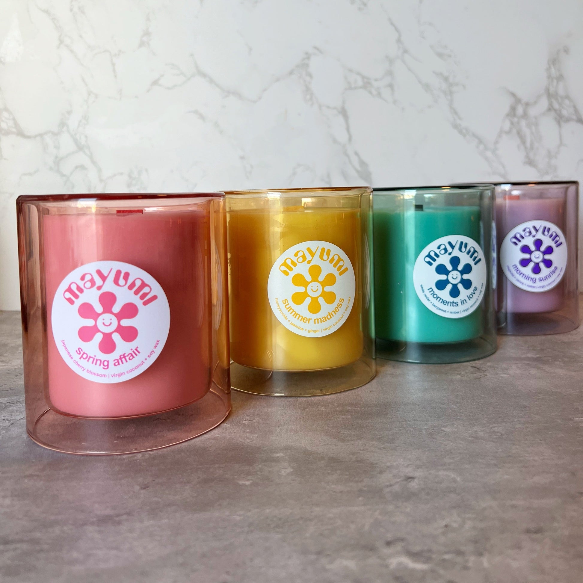 This collection was released during AAPI heritage month and inspired by colorful, delicate notes that would be found in an Asian Garden. Hand-poured candles are whisked with natural plant dyes, set with a plant-dyed wooden wick, and set in an alluring double-glass vessel for a sleek, monochromatic look. As always, all candle names are inspired by songs they are named after. Listen to the Mayumi Goods playlist here.