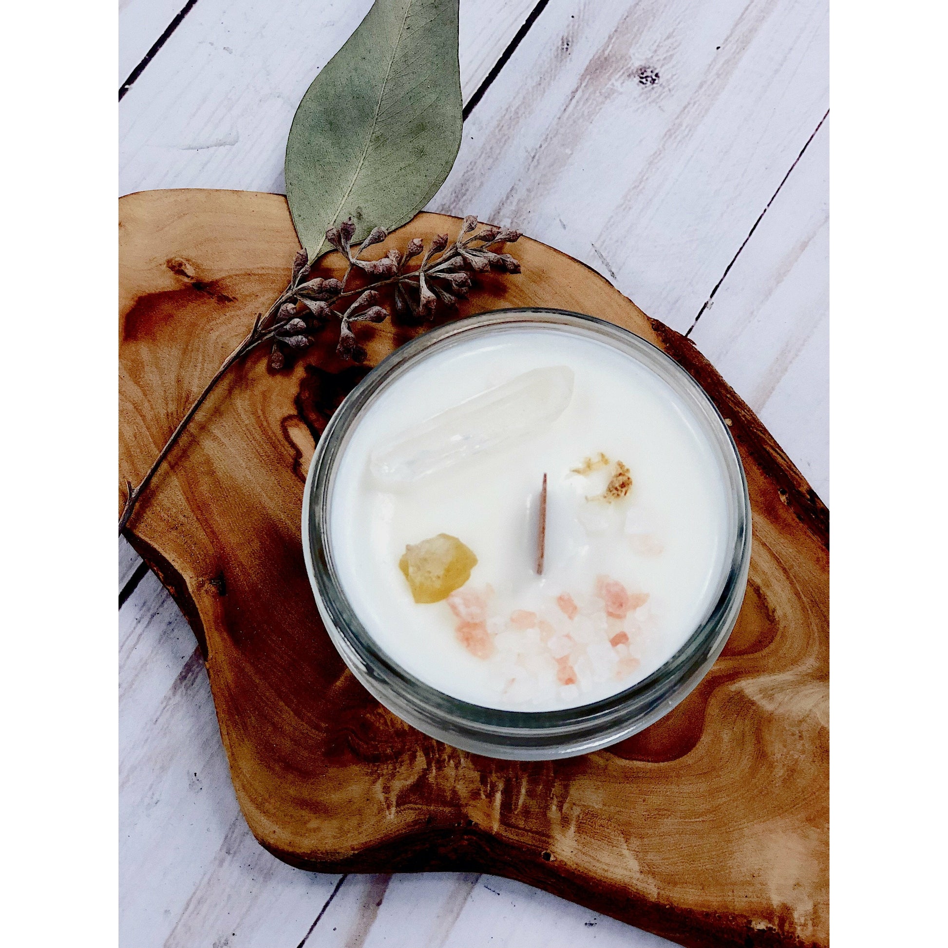 - Made with hand-poured soy wax with extra long burning time, this candle is to be set with intention and peace. Clears negative energy, absorbs "bad vibes" and resets the energy of a space. Topped with palo santo and frankincense resin, these two elements can be burned simultaneously on top of the candle or even next to the candle on a plate.